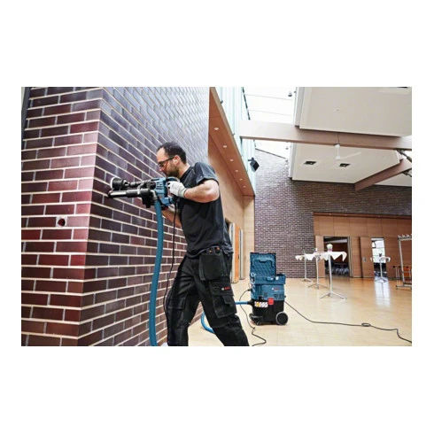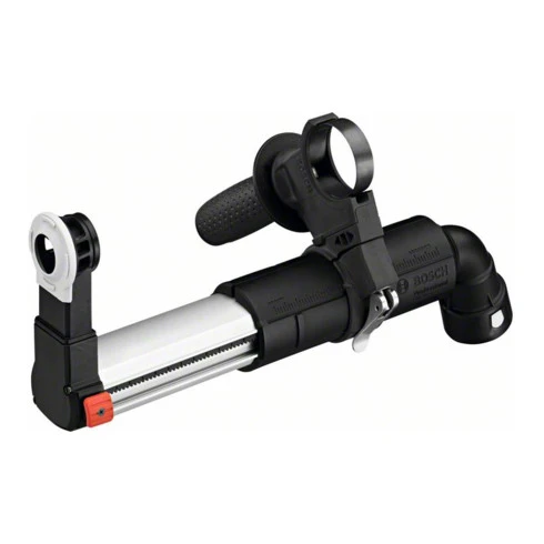 Accessoires divers GDE 16 Plus; Perçage rapide et presque sans poussières avec SDS plus; Pour un travail propre : quasiment aucun nettoyage ultérieur requis; Simple à manipuler : raccordement au perforateur SDS plus et à l’aspirateur de poussières en un clic; Fonctionne avec tous les perforateurs SDS plus Bosch de 2 et 3 kg avec collier de broche de 50 mm; Travail précis grâce aux solides rails télescopiques en aluminium; Flexibilité maximale : convient pour les droitiers et les gauchers – amovible si nécessaire; Particulièrement adaptée pour les scies-trépans jusqu’à 82 mm de diamètre; Parfaitement adapté au système Bosch Click & Clean (raccordement d’aspiration direct possible)