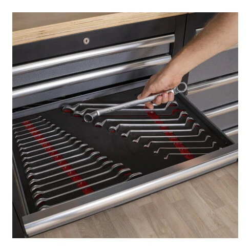 - Dans un plateau en mousse souple de haute qualité (LxlxH : 570 x 400 x 30 mm) pour rangement en établi ou servante d’atelier
