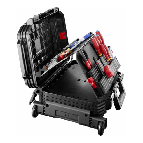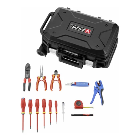- Pince à sertir 449B, lampe stylo, mètre ruban 3m, 4x tournevis SL 1000V, 2x tournevis PZ 1000V, détecteur de tension, pince à câble 1000V, pince coupante diagonale 1000V, pince à dénuder automatique, outil pour dénuder, mallette à roulettes