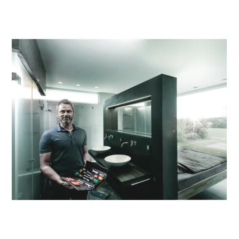 Composition compacte de 15 outils courants pour les installateurs sanitaires et les chauffagistes. Avec 2 clés mixtes à cliquet Joker Switch, manche VDE et 4 lames extra slim, testeur de phase, 4 clés mâles coudées, tournevis-burins et 2 tournevis creux Kraftform Plus. Les détails: Deux clés mixtes à cliquet coudées Joker avec inverseur et platine spéciale pour tenir la vis, servir de butée et augmenter la résistance; 1 manche VDE et 4 lames VDE iS pour travailler en toute sécurité jusqu’à 1000 Volts (iS avec amincissement d’âme et isolant intégré au diamètre pour visser en fond de lamage); 1 testeur de phase 247; 4 clés mâles coudées Hex-Plus Profil pour ne pas arrondir les vis; 1 tournevis-burin Kraftform 932 A (plat) avec lame 6 pans et plaque de frappe pour le vissage et burinage léger; 2 tournevis creux 395 HO pour visser sur goujons. Avec système „Take it easy“ pour trouver facilement le bon outil grâce à la couleur et au marquage de la taille en grand.